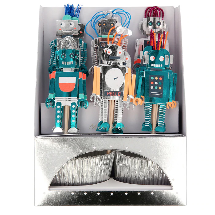 Inhalt: 24 Cupcake-Topper mit 6 Roboter-Designs, Holzsticks, Cupcake-Förmchen