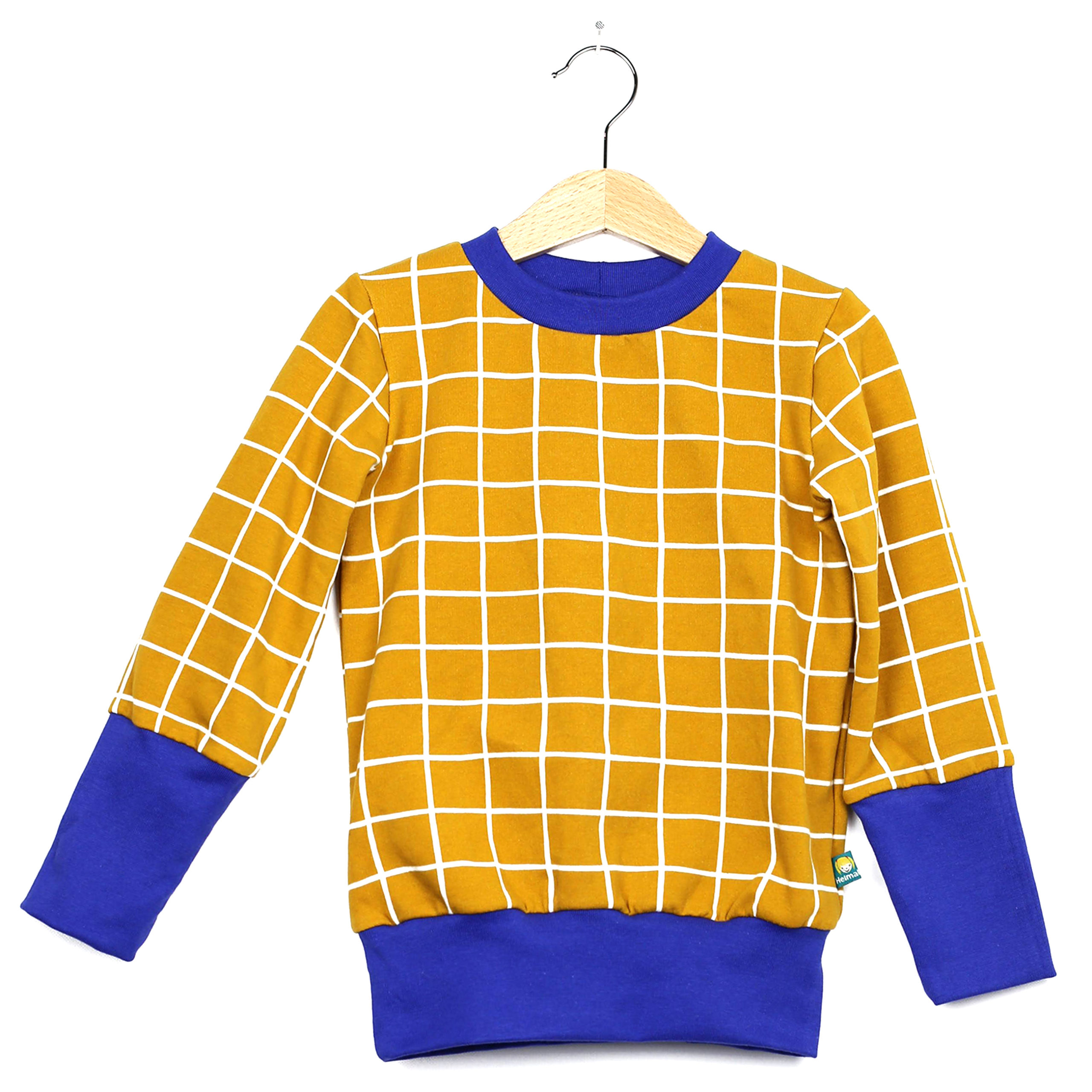 Zwei unserer Lieblingsfarben in der perfekten Kombi. Senfgelb und Knallblau! Der Sweat mit dem Gridmuster ist sooooo kuschelig.